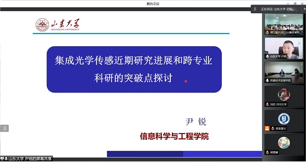 尹锐博士主要从事基于SOI、SiO2、LiNbO3、LNOI等材料的光通信专用光学器件设计,基于铌酸锂薄膜(LNOI)的变频波导阵列光栅(AWG)的理论、基于集成光波导器件的光学传感等研究工作。报告会上,尹锐博士作了关于“集成光学传感近期研究进展和跨专业科研的突破点探讨”的学术报告。尹博士结合近期的研究工作,首先介绍了仪器科学领域对集成光学传感器高灵敏度、高准确度、高分辨率和宽量程等方面的实际需求,分析了基于集成光学的压力、温度、生化传感器等的研究现状,随后介绍了光学测试计量领域高分辨率光波长测量器件研究方面的最新研究成果,最后针对如何开展学科交叉研究提出了“找准定位、突出特点、克服困难、因地制宜”的突破方法。