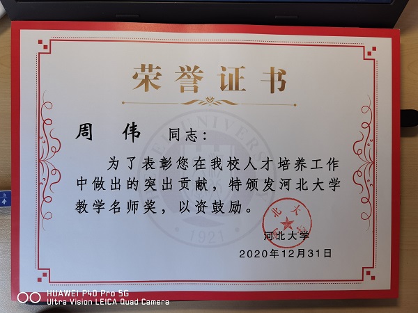根据《河北大学教学名师评选管理办法》(校政字[2020]41号),学校组织开展了2020年河北大学教学名师评选工作,我院周伟教授荣获“2020年河北大学教学名师奖”。