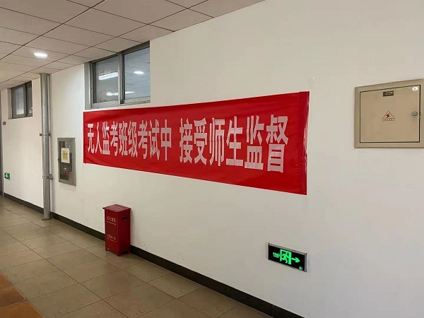 “无人监考考场”门外贴有标识牌,接受全体师生监督。考生进入考场后,自觉清理考场,将考试相关资料和无关用品放到指定位置。在考试过程中,“无人监考考场”的31名学生安静答题,考场秩序井然,无违纪、作弊情况发生。