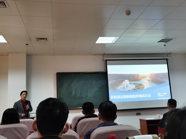 谭超教授的主要研究方向为过程层析成像技术、两相/多相流在线检测技术以及多传感器信息融合技术。报告会上,谭超教授作了关于“多相流过程参数超声测试方法”的学术报告。谭超教授首先以多相流的基础知识进行了铺垫,随后将自己多年来从事相含率测量、流速测量和层析成像等方面的相关研究成果逐步展开,主要包括连续超声多普勒、脉冲超声多普勒等流速测量技术以及国际领先的超声层析成像图像重建技术等。