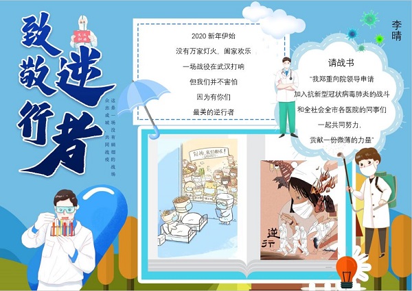 勇士逆行抗疫,雄风威震四方。全体质监学子在学院领导和老师的组织下,除了自觉地签到打卡健康日报、学习网课教程,还用手中的笔讴歌疫情第一线的英雄勇士、用最美的画祈福平安、用学习软件制作小作品致敬英雄、用“此刻我和家人在一起”的全家福助力武汉,不一样的元宵节还将用“小视频录播”的方式诊视时光和家人,安静的在家为武汉加油。