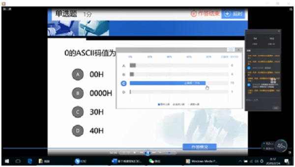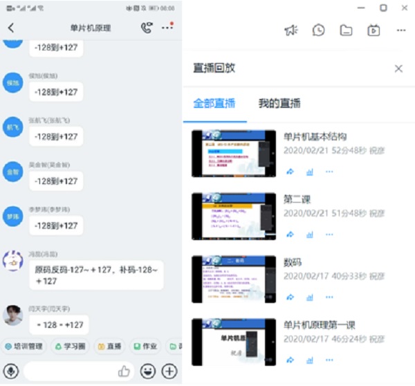 课堂过程中,利用钉钉的聊天窗口随时进行简单问答题的互动,利用手机雨课堂进行随机点名、发布测试,并将测试结果投屏到电脑屏幕,供同学们查看。课堂结束后,学生们可以直接观看直播回放。