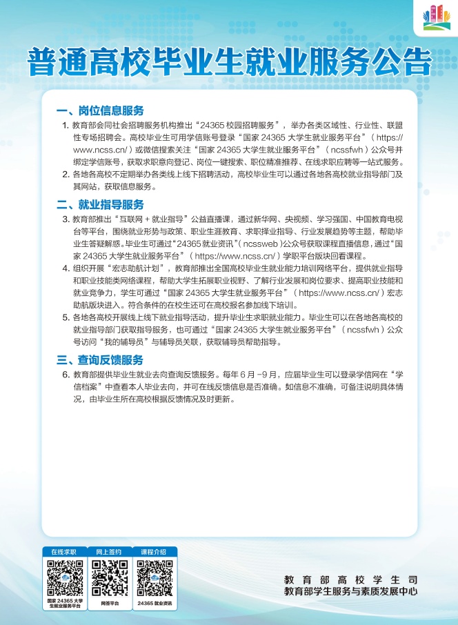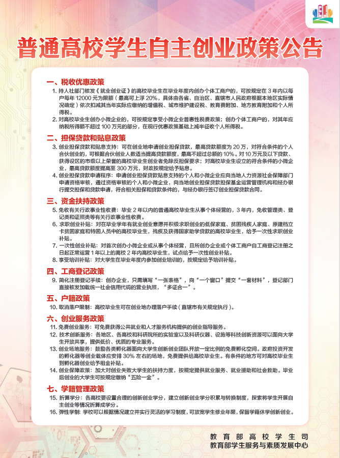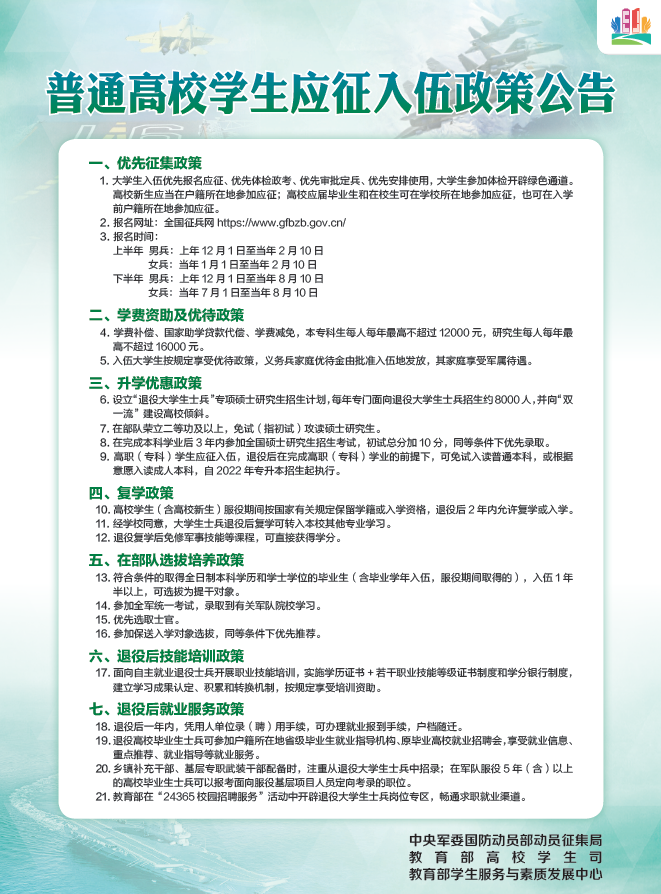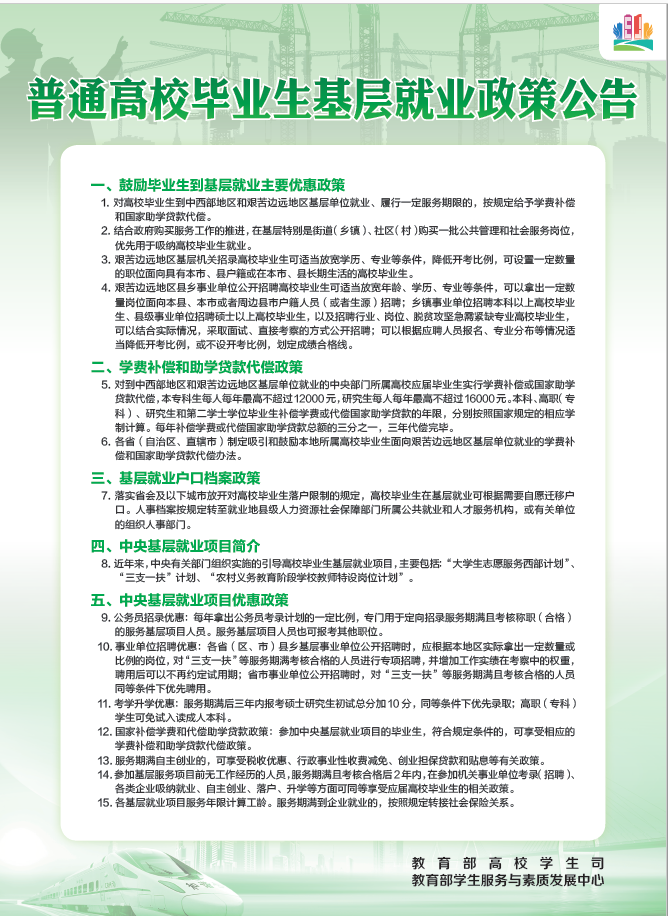 为深入贯彻落实《教育部办公厅关于开展2022年高校毕业生就业创业政策宣传月活动的通知》(教学厅函〔2022〕7 号)精神及要求,现将《普通高校毕业生基层就业政策公告》《普通高校学生自主创业政策公告》《普通高校学生应征入伍政策公告》《普通高校毕业生就业服务公告》等就业政策公布如下,请各班级广泛宣传解读。